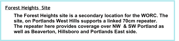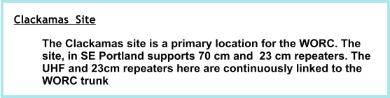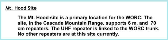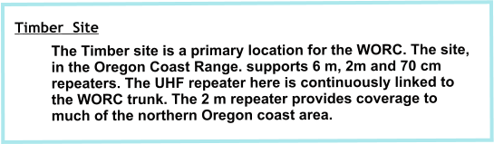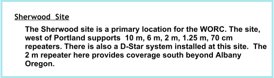Repeater Sites11-3-2024The Western Oregon Radio Club system consists of 12 repeater sites, providing 24 separate repeaters on 7 bands. Available modes include FM voice repeatersas well as D-Star digital voice repeaters. Our linking radio systems operate with advancedtechnology in the UHF bands and higher to provide the best possible audio quality. The repeaters all provide CTCSS transmissions to eliminate RF noise.